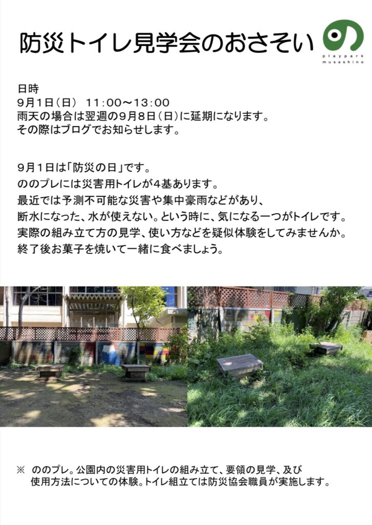 9/1(日)防災トイレ見学会のおさそい 2024.08.23 NPO Screenshot 9月1日は「防災の日」です。 ののプレでは予期せぬ災害に備え、災害用トイレの組み立て、使用方法の見学会を行います! 日時:9月1日(日)11:00〜13:00 終了後には、かまどでお菓子を焼いてたべたいと思っています。お気軽にお越しください! ※予約やお金はいらないよ!